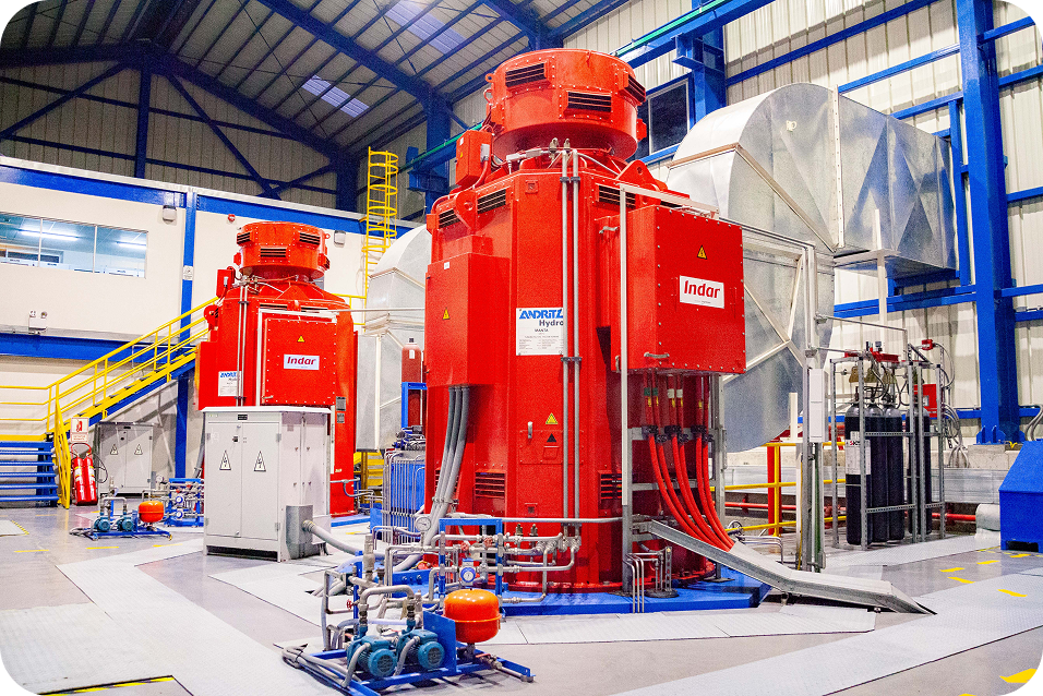 El agua impulsa 2 turbinas Pelton, transformando la energía cinética en electricidad.